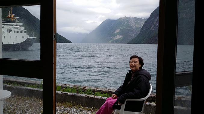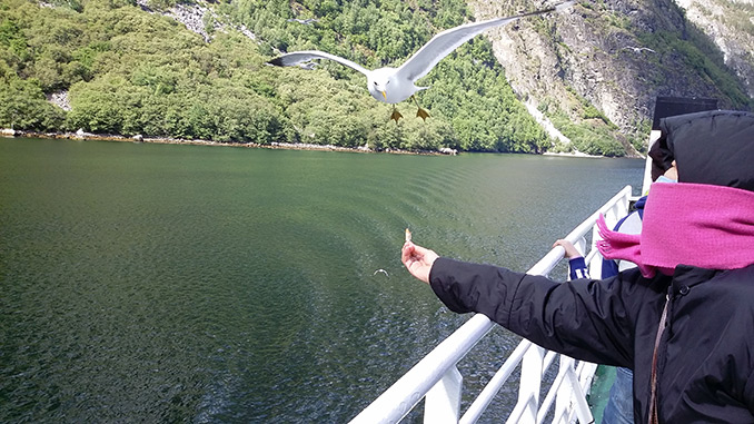 구드방겐까지 페리를 타고 송네 피요르드를 감상하면서, 빵을 내밀면 갈매기들이 날아와 잽싸게 물고 날아가는 것을 보는 것도 재미를 더해 주었다. 구드방겐을 거쳐 밤늦게 베르겐에 도착했다.