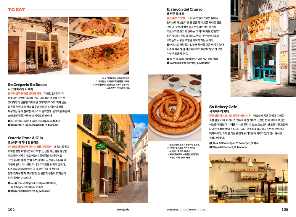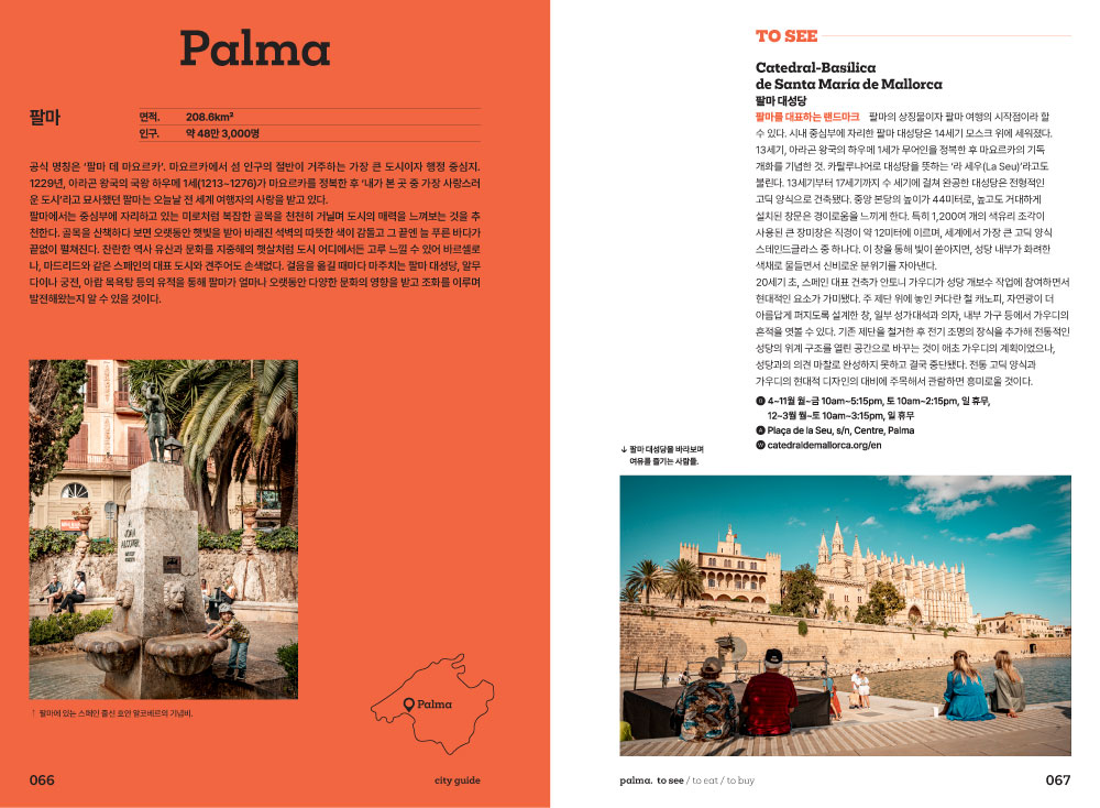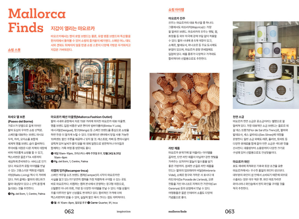 낯설지만 매력적인 마요르카와 첫인사를 나누는 시간. 마요르카 여행에서 빼놓을 수 없는 핵심 포인트인 최고의 해변, 다채로운 액티비티, 쇼핑정보, 미식 정보가 담겨져 있습니다. 여행 스타일에 맞는 추천 여행법을 통해 나만의 마요르카 여행을 꿈꿔봅니다.
